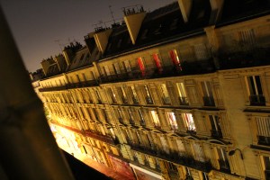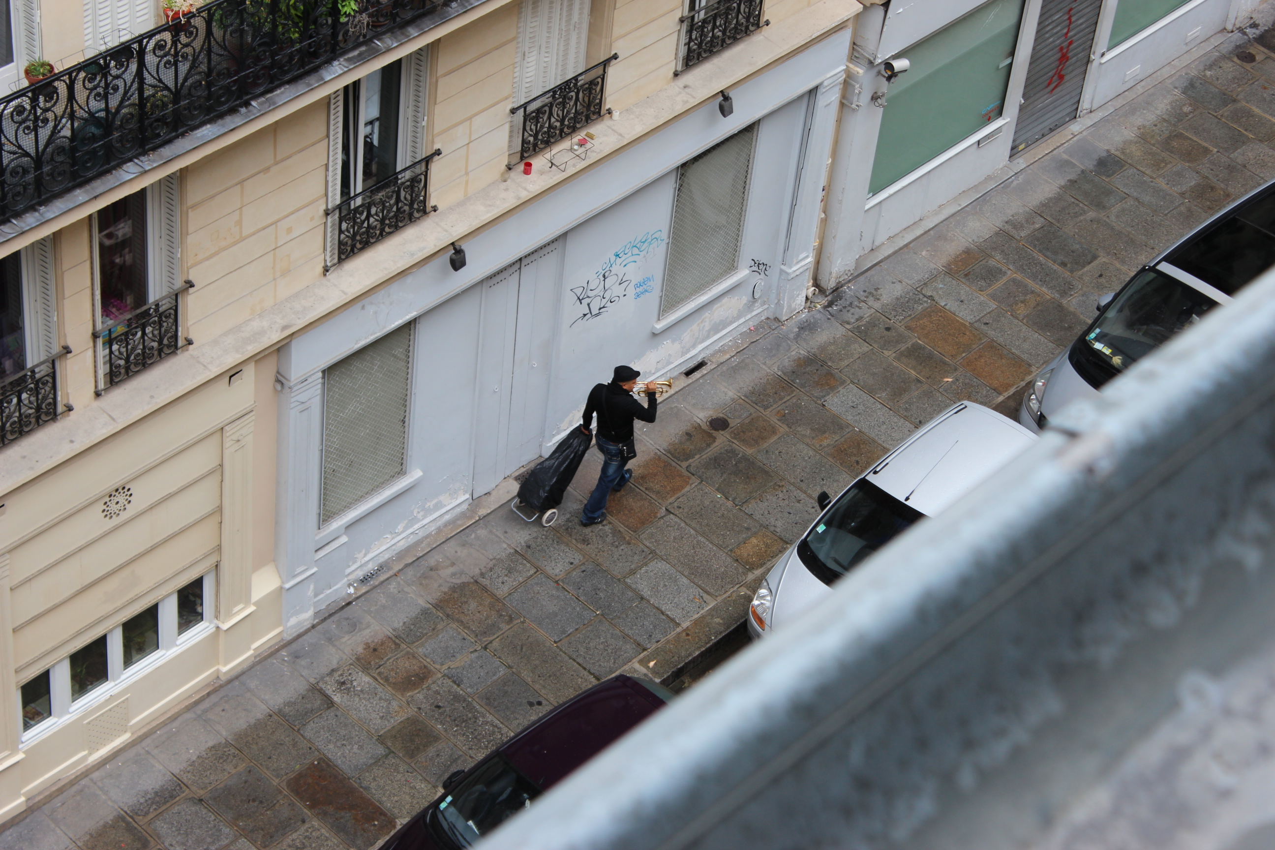 My window looks onto the Rue Clapeyron, all is no longer quiet!. Down which a trumpet player and alto sax player are walking trailing their boom box on wheels as they bounce their brass up the seven storey limestone clad walls.